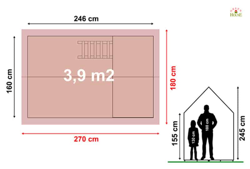 • L’intérieur ayant une hauteur de 245cm, un adulte y rentre debout sans problème. Sur les côtés la hauteur minimale est de 155cm.