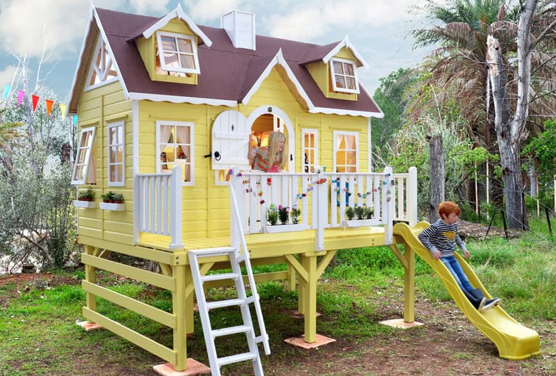 - Grande cabane sur pilotis pour enfant Super Paris avec toboggan, porche, lit superposé intérieur et lucarnes au plafond. Dimensions au socle 326cm longueur x 240cm largeur le porche inclus.