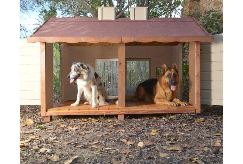 GRANDE NICHE POUR DEUX CHIENS Niche double pour chiens, pour 2 chiens ou plus, ou tout type d'animal de compagnie. Conçue pour une utilisation en extérieur : jardin, terrasse, patio... 100% étanche. Niche pour deux chiens avec 2 compartiments de 85 cm x 97 cm, chacun avec sa propre porte d'accès et porte pour le nettoyage. Les compartiments peuvent être séparés ou communiqués entre eux, grâce au séparateur à porte coulissante qu'il comprend. Les dimensions extérieures sont de 195 cm x 135 cm x 125 cm de haut. Y compris l'avancée du toit. Les dimensions intérieures utiles sont de 171 cm x 97 cm x 108 cm de haut. Les larges portes d'entrée sont utiles pour les grandes races (55 cm x 36 cm) L'auvent de la porte et la cheminée sont décoratifs. Large porte de chaque côté pour faciliter le nettoyage de l'intérieur. Comprend un tiroir dans chaque porte pour ranger les fournitures pour animaux de compagnie ; collier, laisse, brosse, insecticide etc. Mesure 84 x 50 cm. Poids total de la niche 179 kg. Livré en panneaux pré-assemblés avec un simple manuel d'assemblage photographiquedes fenêtres. Niches pour grands chien.