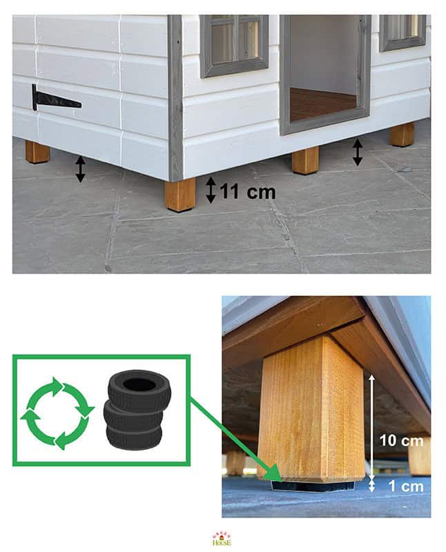 SOALHOS: O soalho tem um espessura total de 34 mm. Uma camada interior de lâminas de pinho macizo de 22mm e uma camada exterior de 12 mm de espessura do tabuleiro de partículas OSB hidrófugo. Além disso, para isolar a casota da humidade do solo,foi elevada sobre uns pés de 11 cm de altura, com uns tacos de borracha antihumidade provenientes de pneus reutilizados.